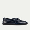 Navy eel leather slip-on that takes a second to put on and carries you from boat to table. Visible stitching construction, tone-on-tone leather decorative lace, flat rubber sole.